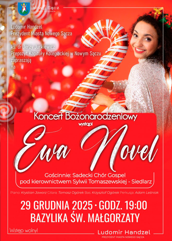 Wyjątkowy wieczór kolęd i świątecznych melodii w sercu Nowego Sącza. W Bazylice św. Małgorzaty zabrzmią znane i lubiane utwory bożonarodzeniowe w wykonaniu Ewy Novel oraz Sądeckiego Chóru Gospel. Wstęp wolny.