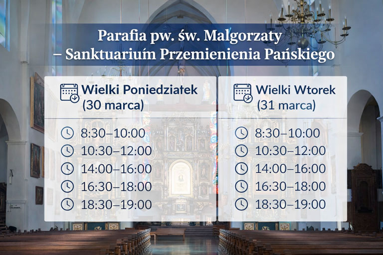 8:30–10:00, 10:30–12:00, 14:00–16:00, 16:30–18:00, 18:30–19:00 - Wielki Wtorek (31 marca):